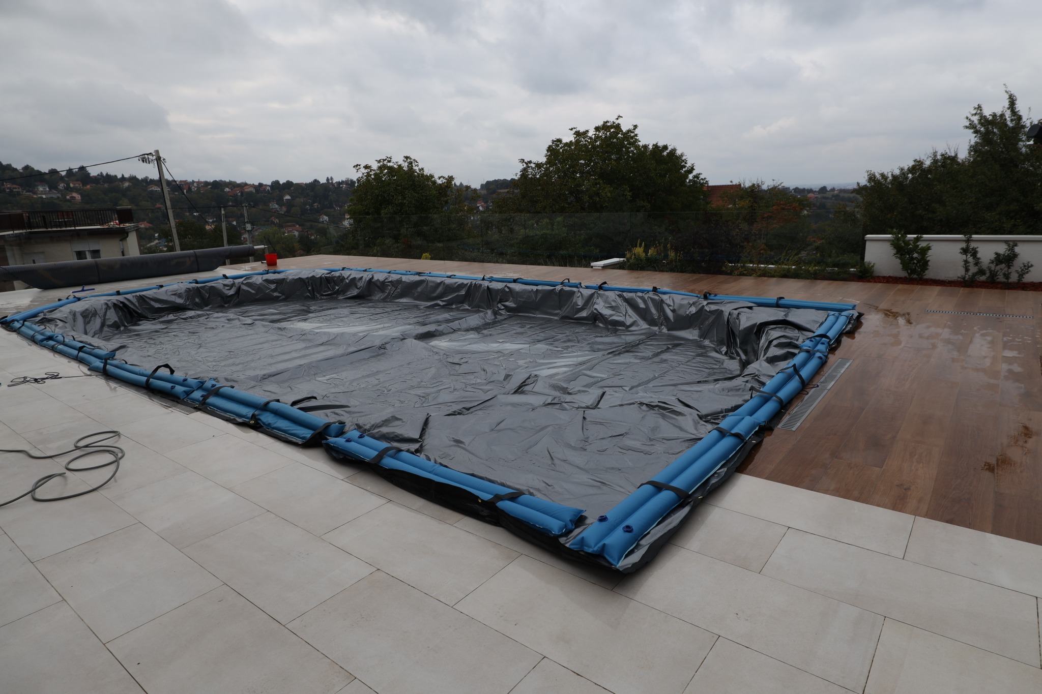 Postavljanje vodenih tegova i zimske prekrivke za prezimljavanje bazena.